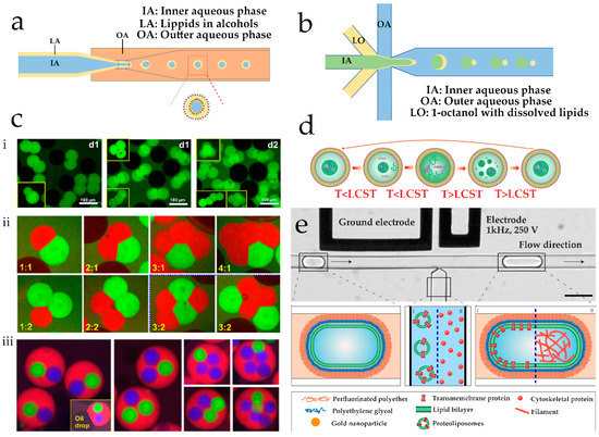 - Matosevic, S. Synthesizing artificial cells from giant unilamellar vesicles: State-of-the art in the development of microfluidic technology. Bioessays 2012, 34, 992–1001. [Google Scholar] [CrossRef] [PubMed]