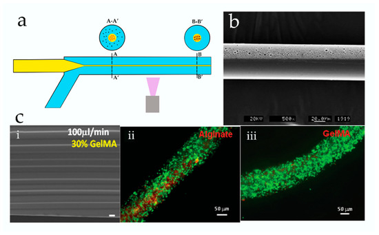 - Zuo, Y.; He, X.; Yang, Y.; Wei, D.; Sun, J.; Zhong, M.; Xie, R.; Fan, H.; Zhang, X. Microfluidic-based generation of functional microfibers for biomimetic complex tissue construction. Acta Biomater. 2016, 38, 153–162. [Google Scholar] [CrossRef] [PubMed]
