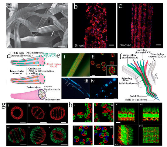 - Shi, X.; Ostrovidov, S.; Zhao, Y.; Liang, X.; Kasuya, M.; Kurihara, K.; Nakajima, K.; Bae, H.; Wu, H.; Khademhosseini, A. Microfluidic spinning of cell-responsive grooved microfibers. Adv. Funct. Mater. 2015, 25, 2250–2259. [Google Scholar] [CrossRef]