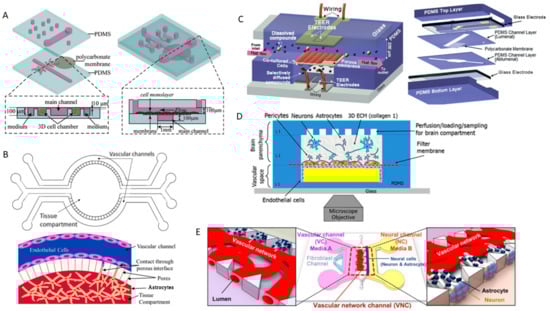 Schematic diagrams of blood-brain barrier (BBB)-on-chip models. (A) microchip BBB model [161]; (B) Neonatal BBB-on-chip [163]; (C) µBBB system [164]; (D) Neurovascular microfluidic bioreactor [165]; (E) 3D microfluidic neurovascular unit platform [166].