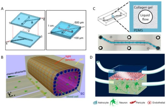 Schematic diagrams of BBB disruption models. (A) BBB chip. Figure adapted from [170]; (B) 3D in vitro BBB model [130]; (C) 3D microfluidic BBB chip [171]; (D) Neurovascular unit microfluidic device [172].