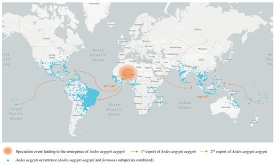 Global dissemination of Ae. aegypti species. Ae. aegypti (Aaa and Aaf subspecies combined) occurrences (adults, pupae, larvae or eggs) are indicated by blue dots. Occurrence data have been retrieved from the global geographic database of known occurrences of Ae. aegypti between 1960 and 2014 compiled by Kraemer and colleagues [137]. The Aaa subspecies most likely emerged during a single sub-speciation event around 4000 years ago, during the severe drying events that accompanied the expansion of the Sahara in the Northern part of Africa [4,119,120,121]. As confirmed through several genetic analyses performed using either nuclear or mitochondrial markers and microsatellite loci [119,120,121], Aaa was exported to the Americas during the slave trade. By the end of the 19th century, it was probably introduced from America into Asia. Possible additional introductions from the Mediterranean region may also have contributed to the colonization of Asia by this mosquito [4,120,124,125].