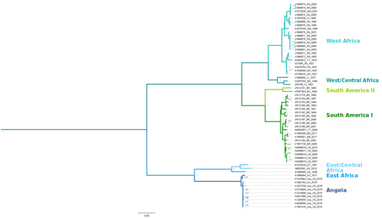 - The American genotypes are grouped in one phylum that apparently emerged from the West African lineage [51,140,143] and therefore these genotypes are clearly of more recent origin (see Figure 3).