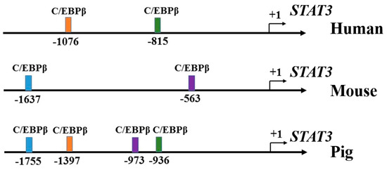 Putative binding sites of CCAAT/enhancer binding protein beta (C/EBPβ) on the promoter of Signal transducer and activator of transcription 3 (STAT3) in humans, mice, and pigs.