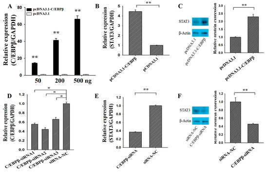 C/EBPβ promotes the mRNA and protein levels of STAT3. (A) Relative expression of C/EBPβ against the different concentrations of pcDNA3.1-C/EBPβ plasmid; the mRNA (B) and protein (C) expression of STAT3 was stimulated by pcDNA3.1-C/EBPβ; (D) relative expression of C/EBPβ knockdown by three siRNAs; the mRNA (E) and protein (F) expression of STAT3 depressed by C/EBPβ-siRNA. ** indicates p < 0.01; * indicates p < 0.05. Data were represented as means ± SD. siRNA: small interfering RNA; siRNA-NC: a siRNA negative control.
