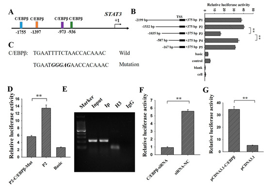 C/EBPβ binding at −1397/−1387 region of STAT3. (A) Predictions of potential C/EBPβ binding sites at the promoter of STAT3; (B) relative luciferase activity of STAT3 promoter after the 5′ deletion of the potential C/EBPβ binding sites; (C) mutation of the potential C/EBPβ binding site (−1397/−1387); (D) relative luciferase activity of P2 after the mutation of −1397/−1387; (E) further confirmation of C/EBPβ binding at −1397/−1387 by ChIP. DNA Marker was 100 bp. Relative luciferase activity of P2 after the knockdown and over-expression of C/EBPβ by C/EBPβ-siRNA (F) and pcDNA3.1-C/EBPβ (G), respectively. ** indicates p < 0.01; * indicates p < 0.05. Data were represented as means ± SD.