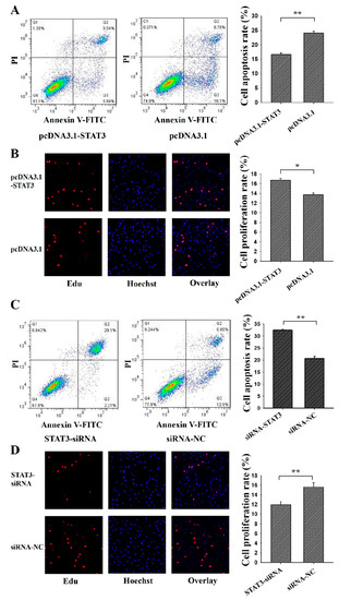 To determine the cellular function of STAT3 on the apoptosis and proliferation, pcDNA3.1-STAT3 or STAT3-siRNA was transfected into porcine GCs (Figure 4). Annexin V-FITC flow cytometry and Edu staining were used to analysis the cell apoptosis and proliferation, respectively. Results showed that the apoptosis rate of GCs in the pcDNA3.1-STAT3 group was significantly lower than the control group (Figure 4A), and the proliferation rate in the pcDNA3.1-STAT3 group was significantly higher than that in the control group (Figure 4B). Moreover, the apoptosis rate of GCs in STAT3-siRNA was significantly higher than that in the control group (Figure 4C), and the proliferation rate in STAT3-siRNA group was significantly lower than that in the control group (Figure 4D). These results suggested that STAT3 might inhibit apoptosis and promote proliferation of ovarian GCs.