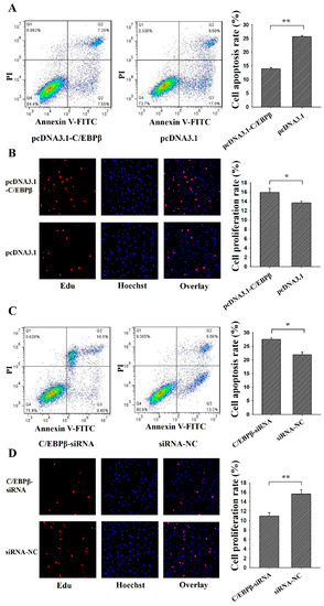 To investigate the function of C/EBPβ on cell apoptosis and cell proliferation, pcDNA3.1-C/EBPβ or C/EBPβ-siRNA was transfected into porcine GCs (Figure 5). Results showed that the apoptosis rate of GCs in pcDNA3.1-C/EBPβ group was significantly lower than that in the control group (Figure 5A), and the proliferation rate in the pcDNA3.1-C/EBPβ group was significantly higher than that in the control group (Figure 5B). Furthermore, the apoptosis rate of GCs in the C/EBPβ-siRNA group was significantly higher than that in the control group (Figure 5C), and the proliferation rate in the C/EBPβ-siRNA group was significantly lower than that in the control group (Figure 5D). These results demonstrated that C/EBPβ might inhibit cell apoptosis and promote cell proliferation for porcine GCs.