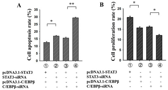 PcDNA3.1-C/EBPβ, C/EBPβ-siRNA, pcDNA3.1-STAT3 and STAT3-siRNA were co-transfected into porcine GCs to analyze the effect of C/EBPβ on the function of STAT3, respectively (Figure 6). For the apoptosis rate of porcine GCs (Figure 6A), group 1 (pcDNA3.1-C/EBPβ + pcDNA3.1-STAT3) was significantly lower than group 2 (pcDNA3.1-C/EBPβ + STAT3-siRNA), and group 3 (pcDNA3.1-STAT3 + C/EBPβ-siRNA) was significantly lower than group 4 (STAT3-siRNA + C/EBPβ-siRNA). These results indicated that C/EBPβ might enhance the antiapoptotic effect of STAT3 in ovarian GCs. For the proliferation rate of porcine GCs (Figure 6B), group 1 (pcDNA3.1-C/EBPβ + pcDNA3.1-STAT3) was significantly higher than group 2 (pcDNA3.1-C/EBPβ + STAT3-siRNA), while group 3 (pcDNA3.1-STAT3 + C/EBPβ-siRNA) was significantly higher than group 4 (STAT3-siRNA + C/EBPβ-siRNA). These results suggested that C/EBPβ might enhance pro-proliferation effects of STAT3 in ovarian GCs.