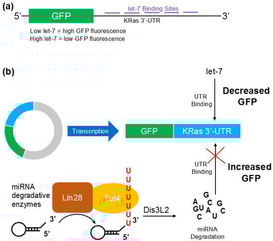 Schematic of the microRNA (miRNA) activity reporter (MiRAR) for let-7 levels in vivo. The KRas 3′-UTR was fused downstream of green fluorescence protein (GFP) to allow quantification of cellular let-7 levels. (a) Schematic of pMiRAR-let-7 construct; (b) miRNA degradative enzymes Lin28 and Tut4 collaborate to mark let-7 miRNA for degradation by the exonuclease Dis3L2. The RNA binding protein Lin28 recruits Tut4 to polyuridylate miRNA and pre-miRNAs, leading to degradation by the U-specific exonuclease Dis3L2. Lowered miRNA levels lead to an increase in GFP translation and fluorescence. KRas: Kirsten rat sarcoma viral oncogene homolog, UTR: untranslated region.
