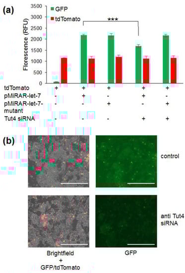 HEK 293 cells were grown to ~80% confluency as described above on a 6-well plate using DMEM supplemented with 1% v/v penicillin-streptomycin (Wisent Inc., Saint-Jean-Baptiste, QC, Canada). Cells were then co-transfected with pMiRAR plasmids, pCMV-tdTomato (632534, Clontech, Mountain View, CA, USA), and RNAs as indicated using Lipofectamine 2000 in Opti-MEM transfection media (11668019, Invitrogen, Carlsbad, CA, USA). Cells were harvested 48 h after transfection. Cell fluorescence was measured using the Synergy H1 microplate reader (BioTek, Winooski, VT, USA) at excitations of 480 nm and 554 nm, and emissions at 509 nm and 581 nm. In each well, a grid of 11 × 11 fields was scanned and fluorescence intensity was recorded. The data reported represent the average GFP and tdTomato fluorescence intensity per well. RNAs co-transfected were as follows: let-7 (5′-p-UGAGGUAGUAGGUUGUGUGGUU-3′) and anti-let-7 (5′-p-AACCACACAACCUACUACCUCA-3′) at 80 pM concentration; hsa-miR-122 (5′-p-UGGAGUGUGACAAUGGUGUUUG-3′) and anti-hsa-miR-122 (5′-p-CAAACACCAUUGUCACACUCCA-3′) at 100 nM. Tut4 knockdown was carried out with anti-Tut4 small interfering RNA (siRNA) (Dharmacon OnTargetPlus System, L-021797-01-0005, Lafayette, CO, USA) according to manufacturer’s instructions. Successful Tut4 knockdown was confirmed by separating 50 μg of total protein from HEK 293 cells treated with Tut siRNA or a scrambled control via SDS-PAGE (SDS-polyacrylamide gel electrophoresis). Proteins were transferred to a polyvinylidene difluoride (PVDF) membrane by western blotting and Tut4 and GAPDH were detected with protein specific antibodies 18980-1-AP (Proteintech, Chicago, IL, USA) and MAB374 (Sigma-Aldrich, St. Louis, MO, USA). All experiments were carried out at least in triplicate; representative cell images are shown.