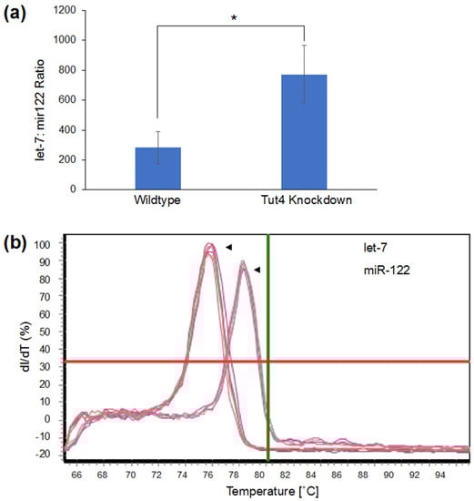 qPCR for let-7 miRNA in wildtype and Tut4-knockdown HEK293 cells. Cells were grown to confluence and total RNA was extracted. (a) Let-7 levels were quantified in relation to miRNA miR-122. miRNA levels in the wildtype and Tut4 knockdown are significantly different (p < 0.03). Error bars are based on three biological replicates and show one standard deviation. (b) Melting curves of let-7 and miR-122 primers are distinct and specific. p values are * < 0.05.