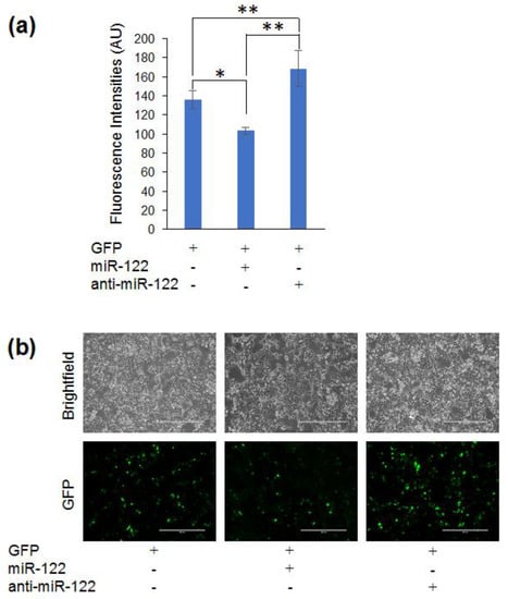 To investigate whether the reporter system is applicable and useful for the reporting of other miRNAs, we generated a similar reporter system for miR-122. The CPEB 3′-UTR encodes 2 miR-122 binding sites and CPEB translation is regulated by cellular miR-122 levels [38]. We fused the CPEB 3′-UTR to gfp to generate a reporter system for miR-122 (pMiRAR-miR-122). Low concentrations of co-transfected miR-122 and anti-miR-122 showed no significant change in fluorescence and transfected RNA concentrations were increased to 100 nM. This led to significant changes in GFP fluorescence (Figure 5a). Transfection with miR-122 at 100 nM led to a 1.2-fold decrease in fluorescence, while the anti-miR-122 led to a 1.3-fold increase in fluorescence (Figure 5a,b). Thus, a reporter with two miRNA binding sites is applicable to more pronounced changes in miRNA activity, while a reporter with five miRNA binding sites may be useful for subtle changes. This demonstrates that with minor modification the MiRAR can be adapted to likely any desired target miRNA or range of sensitivity.