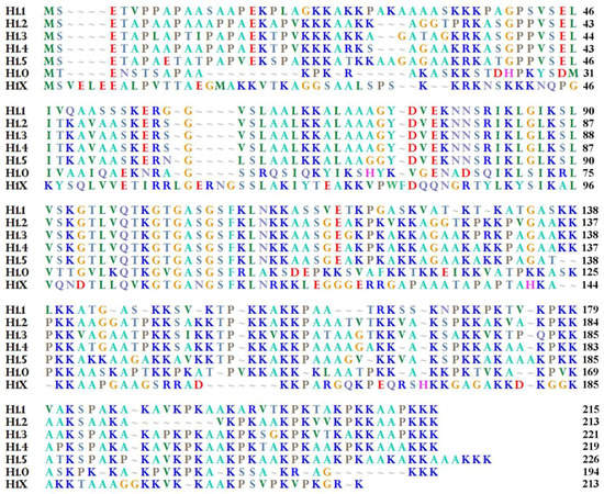 Alignment of all human somatic H1 linker histones. NCBI reference sequences reported: H1.1 (NP_005316.1); H1.2 (NP_005310.1); H1.3 (NP_005311.1); H1.4 (NP_005312.1); H1.5 (NP_005313.1); H1.0 (NP_005309.1); H1.X (NP_006017.1). Alignment of the shown sequences has been done by Bioedit sequence alignment editor [74].