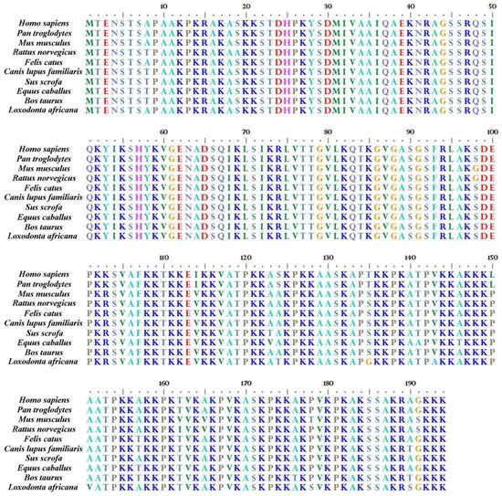 Alignment of H1.0 histones in different mammalian species. NCBI reference sequences reported: Homo sapiens (NP_005309.1); Pan troglodytes (XP_009436643.1); Mus musculus (NP_032223.2); Rattus norvegicus (NP_036710.1); Felis catus (XP_006934092.1); Canis lupus fam. (XP_005625954.1); Sus scrofa (XP_003126085.1); Equus caballus (XP_005606674.1); Bos taurus (NP_001069955.1); Loxodonta africana (XP_010597636.1). Alignment of the shown sequences has been done by Bioedit sequence alignment editor [74].