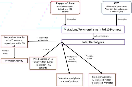 Future studies could validate these observations in additional cell lines, as well as additional healthy volunteers/HCC patient samples, and determine the contribution of non-genetic factors. It would also be pertinent to address whether the polymorphisms or differential methylation at the FAT10 promoter would modulate the response of the FAT10 promoter to inflammatory cytokines, including TNFα or IFNγ. As the expression of the FAT10 gene was reported to be regulated by p53 [], it would also be interesting to evaluate whether p53 differentially modulates FAT10 expression in cells with different haplotypes of polymorphisms, or a different methylation status at its promoter. Importantly, the association between the FAT10 promoter and HCC pathogenesis can be further clarified, and the role of DNA methyltransferases in modulating the promoter activity of FAT10 can be elucidated.