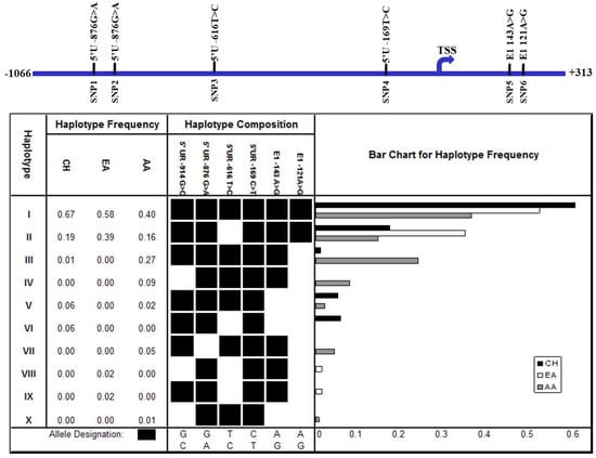 From the genotype data of these six SNPs, a total of 10 haplotypes were inferred from the different populations using an expectation maximization (EM) algorithm in the ArlequinTM software program (Figure 3). Haplotypes I and II occurred at high frequencies in all of the populations examined, with haplotype I occurring at the highest frequency in the CH population, while haplotype II occurred at the highest frequency in the EA population (Figure 3). Haplotype III occurred at a relatively high frequency in the AA population (27%), but at a low frequency in the CH population (1%), and was not observed in the EA population. Haplotype V occurred at a low frequency in both the CH and AA populations, but was not observed in the EA population, while haplotypes IV, VII, and X were only observed at a low frequency in the AA (<10%) population, but not in the other populations. Haplotype VI only occurred at a low frequency in the CH population, while haplotypes VIII and IX were observed only in the EA population. These observations suggest that the profiles of haplotypes at the FAT10 promoter region differ in different populations. The profiles of the haplotypes of SNPs at the FAT10 promoter region between the HCC patients and non-HCC patients of similar age were also different, although the difference was not statistically significant (Fisher’s exact test, p > 0.05) (Figure 3. A total of eight haplotypes were inferred from the five SNPs observed in these samples, six of which (I, II, III, IV, V, and VII) were common to the haplotypes observed in the three populations (Figure 3). Four of the common haplotypes (I, II, III, and V) occurred in both the HCC and non-HCC individuals, although there were slight differences in the allele frequencies between the HCC and non-HCC individuals. Haplotypes IV, VII, and XI were only observed in the HCC patients, while haplotype XII was only observed in the non-HCC individuals.