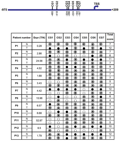 A total of seven CG dinucleotides (CG-1 to CG-7) reside in the region from −975 to +209 bp of the FAT10 promoter, which showed the highest promoter activity (Figure 5). All of these CG dinucleotides reside upstream of the TSS (transcription start site). In order to evaluate the effect of DNA methylation on FAT10 expression, methylation-specific sequencing was utilized to evaluate the methylation status of different CG dinucleotides in the FAT10 promoter region.