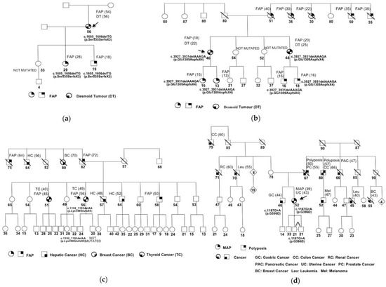 Pedigrees of familial adenomatous polyposis cases (FAP) and MUTYH-associated polyposis (MAP) families with extracolonic manifestations. The ages at diagnosis are indicated in brackets. (a) Family carrying the APC mutation c.1605_1606delTG (p.Ser535SerfsX3); (b) Family carrying the APC mutation c.3927_3931delAAAGA (p.Glu1309AspfsX4); (c) Family carrying the APC mutation c.1192_1193delAA (p.Lys398GlufsX5); (d) Family carrying the MUTYH mutation c.1187G>A (p.G396D).