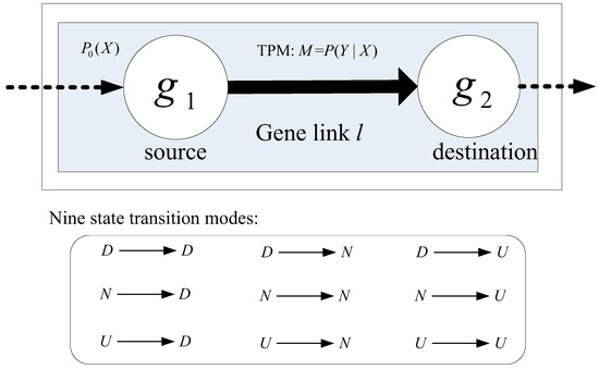 Given a gene link l from g1 to g2 and a Ntrain-sample training set for class control/case, we denote the initial state distribution as P0(x), x = D, N, or U for the source gene g1 and the TPM as M = {mij, i, j = 1, 2, 3}, where mij represents the regulatory state transition probability from the i-th state on gene g1 to the j-th state on gene g2. Totally, there are nine state transition modes, as shown in Figure 2. The initial distribution P0(x) is estimated as the likelihood of gene g1 being in state x—in other words, the frequency of gene g1 being in state x in the training set, is