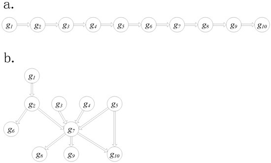Two types of pathway structures: (a) the cascade structure, and (b) the complex structure used in simulation data.