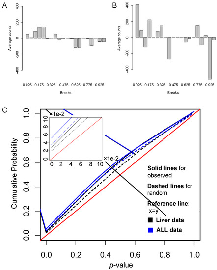 Differences between the p-value distributions of true gene links and random links on liver data and ALL data. (A,B) The differences between counts of p-values resulted by the true gene links and the randomly generated links in each bin for (A) liver data, (B) ALL data, and (C) the cumulative probability distributions of p-values of true links and random links on liver data and ALL data.