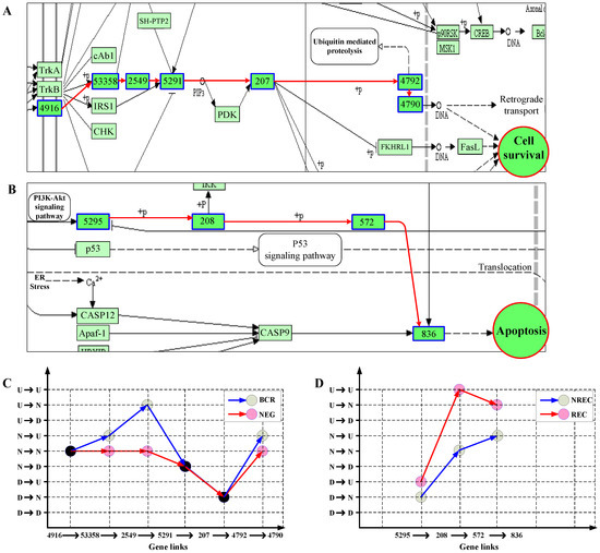 Biological information is necessary to propagate along pathway networks for the mediation and maintenance of the life of cells. Such signaling should be manifested in the state transition patterns of gene chains. We then recognized the principal patterns of pathways specific to each of the two classes for the ALL and liver datasets. For the ALL data, take neurotrophin signaling pathway as example and consider one of the two significant NF-κB-ending cascades, i.e., 4916 → 53358 → 2549 → 5291 → 207 → 4792 → 4790 (Entrez IDs), as shown in Figure 6A. Figure 6C compares the principal patterns of the cascade between the two ALL classes, BCR and NEG. From Figure 6C, we can clearly see that the two classes have two distinct state transition patterns with respective to the link cascade. Especially, in NEG, the consecutive D or N states along the path lead to the low expression of NF-κB, implying the suppression of cellular survival in NEG. We also noticed that signaling protein, GAB1 (Entrez ID: 2549), is mainly upregulated in BCR but not in NEG. This is in accordance with the experimental observation that GAB1 is tyrosine-phosphorylated in response to B cell antigen receptor engagement [36,37]. For the liver cancer data, similar results were also obtained. Figure 6B,D shows the result for one of three-link chain in differentially expressed hepatitis B pathway: 5295 → 208 → 572 → 863 (Entrez IDs), which is involved in the activation cascade of caspases responsible for apoptosis execution. From Figure 6B,D, it can be seen that the principal pattern in NREC, D → N → N → U, leads to overexpression of CASP3 (Entrez ID: 863), and finally, activates the apoptosis of cell. This is consistent with the non-recurrence of liver cancer in NREC patients.