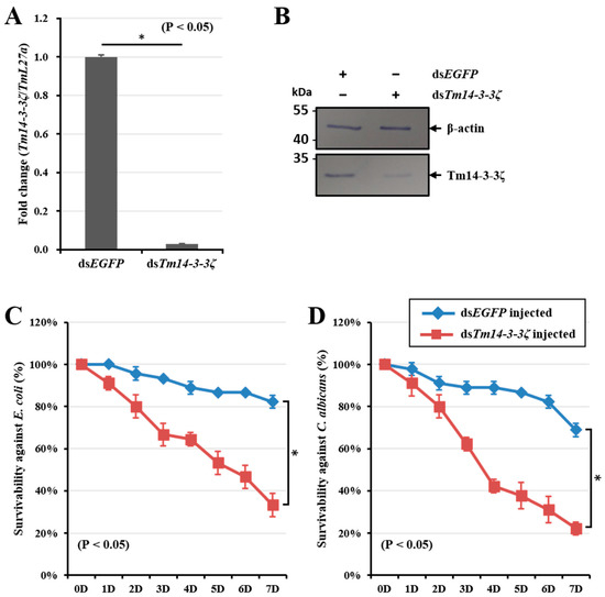 To investigate the function of Tm14-3-3ζ in the survival of the larvae against E. coli and C. albicans infection, we injected Tm14-3-3ζ dsRNA to the host larvae thereby setting a gene silencing model. The efficiency of Tm14-3-3ζ silencing was found to be 95-fold as compared with the dsEGFP injected group. The study was conducted in three biological replications and the silencing of Tm14-3-3ζ transcripts was found to be significant (Figure 5A). The dsRNA induced silencing of Tm14-3-3ζ transcript was also noticed at the protein level using Tm14-3-3ζ antiserum (Figure 5B). Subsequent E. coli and C. albicans inoculation to Tm14-3-3ζ silenced larvae showed a compromised immune response with a decrease in the larval survivability to almost 30% (Figure 5C) and 20% (Figure 5D), respectively. The reduced survivability of T. molitor larvae was significant (p < 0.05) at seven days post-infection of the microbes.