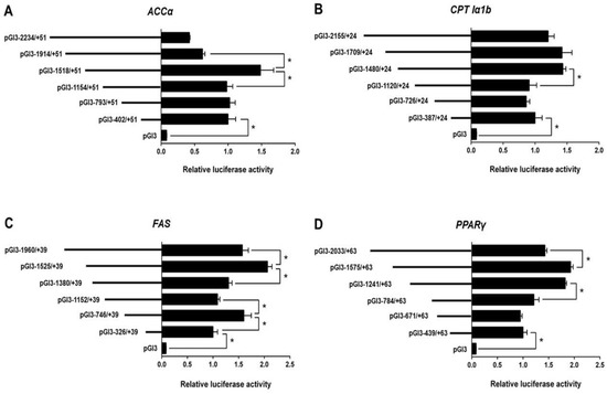 3.2. 5′-Deletion Assay of the Promoter Regions of ACCα, CPT Iα1b, FAS, and PPARγ