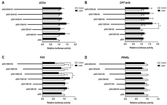 5′ unidirectional deletion assays for promoter regions of ACCα, CPT Iα1b, FAS and PPARγ after leptin treatment. (A) Assays for the ACCα promoter region; (B) assays for the CPT Iα1b promoter region; (C) assays for the FAS promoter region; (D) assays for the PPARγ promoter region. Values showed the ratio of activities of firefly to Renilla luciferase, normalized to the control. Results were presented as mean ± SEM (n = 3). Asterisk (*) indicates significant differences between different 5′ unidirectional deletion plasmids under the same treatment (p < 0.05). Different letters indicate significant differences between different treatments in the same plasmid (p < 0.05).