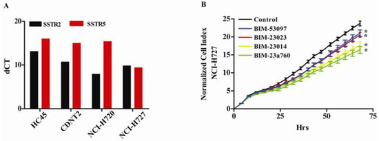 3.1. Somatostatin and Dopamine Analogues Inhibit the Growth of a Carcinoid Cell Line NCI-H727