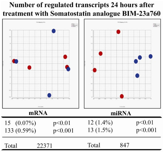 After having seen that SST analogues inhibit growth we treated NCI-H727 cells with the most potent inhibitor—BIM-23A760—and compared the mRNA and miRNA profiles of treated cells with that of untreated cells (Figure 2). PCA plots based on either mRNAs or miRNAs of cells treated with SST analogue showed that PCA based miRNA expression profiles clearly separated controls from treated cells. In contrast, PCA based mRNA profiles did not (Figure 2). Furthermore, when calculating the number of transcripts changed and regulated by SST 24 h after treatment it is clear that treating with SST regulates miRNAs to a higher degree than mRNAs (Figure 2).