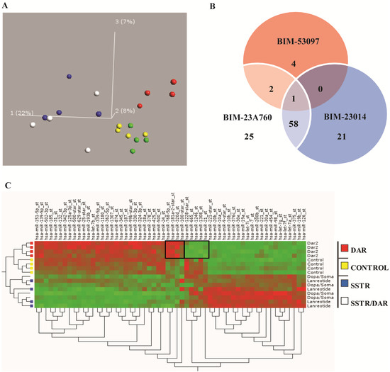 PCA shows specific miRNA expression depending on receptor activation. (A) The unbiased PCA separates the samples based on variation in the expression of miRNA in each sample. In the first dimension samples treated with BIM-23014 (blue—SSTR agonist) and BIM- 23A760 (white—SSTR and dopamine receptor D2 (DRD2) chimeric agonist) separated from the others. BIM-23023 (green—SSTR) did not separate from the control (yellow). Also in the first dimension BIM-53097 (red—DRD2) did not separate from the controls. However, in the third dimension the BIM-53097 (red—DRD2) treated samples clearly separated from the controls. The percentage indicates how much of the total variation is present in each dimension. In this experiment 22% of the total variation of miRNA expression is found in the first dimension, 8% in the second and 7% in the third. The two most potent inhibitors of growth BIM-23A760 and BIM-23014 group together, the DRD2 agonist and the least effective growth inhibitor separates by itself. (B) The Venn diagram shows the miRNAs shared between the different analogue treatments and that the number of miRNAs shared between BIM-23A760 (SSTR-DRD2) and BIM-23014 (SSTR) are greater than BIM-53097 (DRD2). (C) On the right side of the map is the clustering of treatment where DRD2 and controls separate from chimeric compound BIM-23A760 (SSTR-DRD2) and BIM-23014 (SSTR). Furthermore it seems to separate controls and DRD2. Notice in the middle of the control/DRD2 treatment, there is a small fraction of miRNA which seems to be controlled by dopamine alone and different from the control group.
