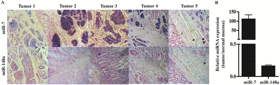- Sakamoto, N.; Naito, Y.; Oue, N.; Sentani, K.; Uraoka, N.; Zarni Oo, H.; Yanagihara, K.; Aoyagi, K.; Sasaki, H.; Yasui, W. MicroRNA-148a is downregulated in gastric cancer, targets MMP7, and indicates tumor invasiveness and poor prognosis. Cancer Sci. 2014, 105, 236–243. [Google Scholar] [CrossRef] [PubMed]