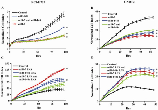 Having demonstrated that SST analogues induced the expression of miR-7 and miR-148a and that both these miRNAs are expressed in NETs, we examined how these miRNAs would affect the growth of both the NCI-H727 and CNDT2 carcinoid cell lines by either over expressing or inhibiting them. Both miR-7 and miR-148a significantly inhibit the growth of carcinoid cells in vitro indicating that these miRNA could mediate some of the growth inhibitory effect induced by SST analogues (Figure 5A,B). We subsequently blocked the effect of miR-7 and miR-148a by transfecting LNA-inhibitors that increased the growth of both carcinoid cell lines (Figure 5C,D).