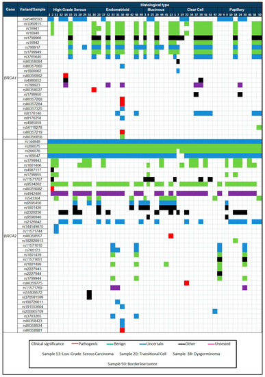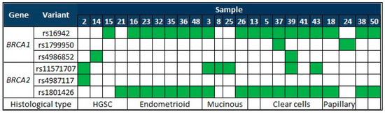 We can see similarities in the BRCA1 variants because rs1060915 (40%), rs16941 (40%), rs16940 (40%), rs1799966 (40%), rs16942 (36%), rs799917 (44%), rs1799949 (38%), rs3765640 (30%) are mostly present in samples with endometrioid and clear cell types. An unusual finding was the detection of 26 variants (four of them pathogenic) in endometrioid sample 36 (Figure 1 and Table S1). All histological types presented similarities in BRCA2 with variants rs144848 (100%), rs206075 (100%), rs206076 (97.9%), rs169547 (95.8%), rs953426 (70.8%). Mutations in BRCA genes are rarely detected in the endometrioid histological type according to the COSMIC database [33]. The majority of mutations, variants, and epigenetic modifications in BRCA1 are reported in the high-grade serous carcinoma samples [22].