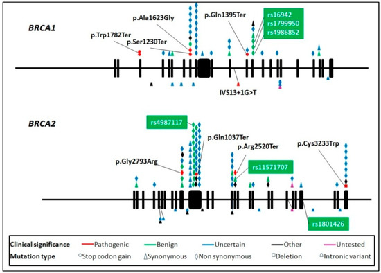 Figure 3 represents the global distributions of variants found in our study across both genes. Variant type and clinical significance and variants previously reported in Mexican ovarian cancer patients are shown [38].