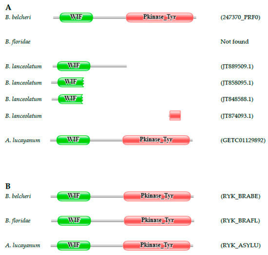 Protein 247370_PRF0 of B. belcheri has a domain organization typical of Ryk receptor tyrosine kinases; they have a Wnt-inhinitory factor (WIF) domain that serves to bind Wnts [36]. Ryk proteins are present in all groups of Bilateria, as well as in Cnidaria [37], therefore, our observation that Ryk proteins are missing from the predicted proteome of B. floridae was surprising (Supplementary Table S1). Our earlier analysis of the B. floridae genome and transcriptome, however, provided evidence for a RYK gene that encodes a protein with the same domain organization as that of B. belcheri [21]. Analysis of the transcriptome of A. lucayanum identified full-length transcripts that confirm the existence and activity of a RYK gene in this lancelet species. The transcriptome of B. lanceolatum also contained transcript fragments derived from its RYK gene; although the full-length protein could not be reconstructed from these fragments, they confirm the existence of an active RYK gene in B. lanceolatum (Figure 1).