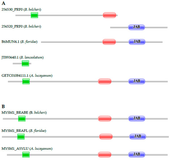 Myb Like, SWIRM And MPN Domains 1 (MYSM1) genes encoding proteins with domain architectures typical of histone H2A deubiquitinases are present in the genomes of B. belcheri, B. floridae, and A. lucayanum. (A) The architectures of the predicted histone H2A deubiquitinases of B. belcheri and B. floridae deviate from the conserved domain architecture of these proteins in that one of the fragments of the B. belcheri protein (256530_PRF0) lacks the JAB domain, another fragment of the B. belcheri ortholog (256520_PRF0) lacks the Myb_DNA-binding and SWIRM domains, whereas the B. floridae protein (B6MUN4.1) lacks the Myb_DNA-binding domain. The transcriptome of A. lucayanum contains full-length transcripts of the MYSM1 gene, but the transcriptome of B. lanceolatum had only one transcript fragment derived from its MYSM1 gene; (B) Re-annotation of the MYSM1 genes of B. belcheri and B. floridae with the FixPred protocol has shown that these deviations are due errors in gene prediction, permitting the correction of these sequences (MYSM1_BRABE, MYSM1_BRAFL). The figure illustrates the Pfam domain architectures of the proteins and position of protein fragments of MYSM1 proteins. Color code for Pfam-A domains: Myb_DNA-binding—green; SWIRM—red; JAB—blue.