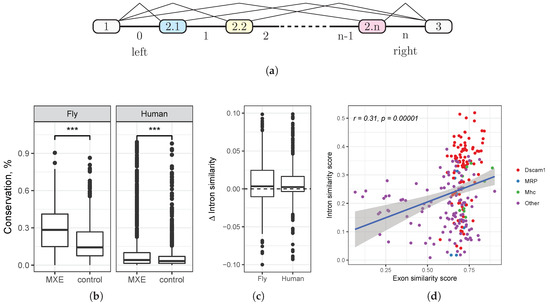 Indeed, the sample of consecutive introns that flank MXE had a significantly larger median similarity score than did the control sample (Mann–Whitney test, ). Since longer introns are more likely to contain similar motifs just by chance, we chose a control sample that was matched by intron length and analyzed differences in similarity scores (Figure 1c). The median difference of similarity scores was significantly greater than zero (Wilcoxon test, in fruit fly, in human), however small by the absolute value (the average difference of about 2% and 1% in fruit fly and human, respectively). The positive shift of the similarity score indicates that consecutive MXE introns contain more homologous regulatory elements such as selector sequences than do other introns. The small absolute value of this shift is not unexpected, as it is on the order of magnitude of 1–2% for a conserved 14-nt stem structure in a 600-nt intron [32].