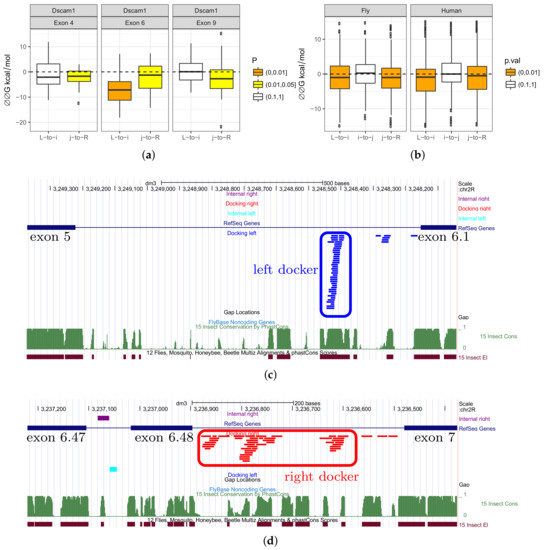 (a) The distribution of the minimum free energy (MFE) differences where is the MFE of hybridization of the actual pair of introns (L-to-i and j-to-R), and is the respective figure for shuffled sequences, for the three largest MXE clusters of Dscam. (b) The distribution of the minimum free energy (MFE) differences for the actual pair of introns (L-to-i, i-to-j, and j-to-R) in fruit fly and human MXE clusters with two exons. Color codes show the significance according to the Wilcoxon signed rank test. (c,d) The predicted docker sequences in the left intron (blue) and in the right intron (red).