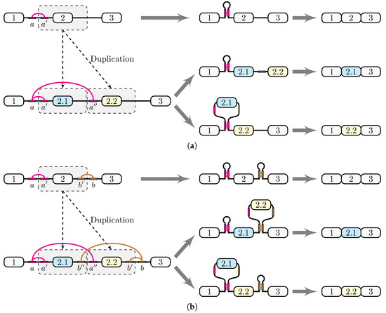 Consider a genomic duplication affecting the genomic region that contains an exon (exon 2) and an intron (Figure 3a). Assume additionally that the intron spanning between exons 1 and 2 contains a pair of complementary sequences, a and , which are capable of forming a stem-loop structure, and that only one of the two complementary parts, , is affected by the duplication. Stem structures often appear in eukaryotic introns as structural units related to constitutive and alternative splicing [34]; they can, in fact, span large distances and function as elements approximating distant splice sites [35].