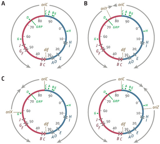 Schematic representation of the replichore arrangement of Escherichia coli chromosomes with ectopic replication origins in different locations. (A) Normal replichore arrangement in E. coli. The origin, oriC, and the dif chromosome dimer resolution site are indicated. ter sites are shown by triangles and are identified by their corresponding letter (“A” indicates the terA site). The numbers represent the minutes of the standard genetic map (0–100 min). Green arrows represent location and direction of transcription of the seven rrn operons: A–E, G, and H. The location marked “GRP” indicates a tight cluster of genes coding for ribosomal proteins, all of which are transcribed co-directionally with replication coming from oriC. (B) Integration site of a 5 kb oriC fragment termed oriY into malT upstream of the rrnD operon. (C) Integration sites of 5 kb oriC fragments into pheA upstream of the rrnG operon, termed oriX (this study), and near the lacZYA operon, termed oriZ [18,19].
