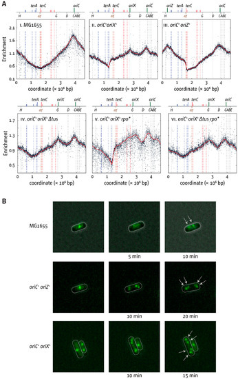 - Wang, X.; Lesterlin, C.; Reyes-Lamothe, R.; Ball, G.; Sherratt, D.J. Replication and segregation of an Escherichia coli chromosome with two replication origins. Proc. Natl. Acad. Sci. USA 2011, 108, E243–E250. [Google Scholar] [CrossRef] [PubMed]