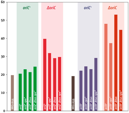Finally, we wanted to investigate growth of a ΔoriC oriX+ oriZ+ construct. A ΔoriC oriX+ oriZ+ construct has a symmetrical replichore arrangement, but forks coming both from oriX and oriZ will still replicate one-quarter of the chromosome in an orientation opposite to normal, which would be expected to impose problems. In line with this assumption, the deletion of oriC increased the doubling time to 35.3 min (Table 3). However, the doubling time of ΔoriC oriX+ oriZ+ cells is still significantly quicker than that of ΔoriC oriX+ cells, suggesting that the presence of oriZ alleviates some of the problems that occur in ΔoriC oriX+ cells.