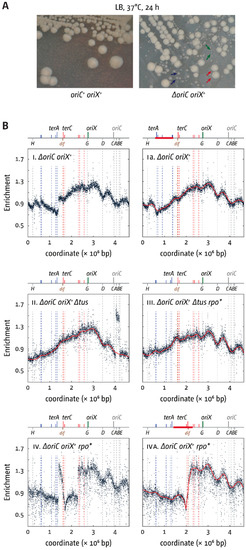 Growth and replication profiles of E. coli cells replicating from a single ectopic replication origin. (A) Large colony variants due to accumulation of suppressor mutations in ΔoriC oriX+ cells. Shown is a streak to single colonies of an overnight culture of both constructs. While an oriC+ oriX+ strain shows largely uniform colony sizes with only some variation due to colony density, a ΔoriC oriX+ construct shows small, medium, and large colonies, as highlighted by green, blue, and red arrows, respectively. The strains used were JD1181 (oriC+ oriX+) and JD1187 (∆oriC oriX+). (B) Replication profiles of E. coli cells with a single ectopic replication origin. Shown is the MFA of E. coli ΔoriC oriX+, ΔoriC oriX+ ∆tus, ΔoriC oriX+ rpo*, and ΔoriC oriX+ ∆tus rpo* cells. The number of reads (normalised against reads for a stationary phase wild-type control) is plotted against the chromosomal location. A schematic representation of the E. coli chromosome showing positions of oriC and oriZ (green line) and ter sites (above), as well as dif and rrn operons A–E, G, and H (below), is shown above the plotted data. Clear discontinuities of the profiles can be seen in panels i, ii, and iv. For panels i and iv, these are due to large inversions, as highlighted by the continuous replication profile that results if the area highlighted in red in the schematic representation of the chromosome is inverted. The strains used were JD1187 (ΔoriC oriX+), JD1208 (ΔoriC oriX+ ∆tus), JD1197 (ΔoriC oriX+ rpo*), and JD1209 (ΔoriC oriX+ ∆tus rpo*).