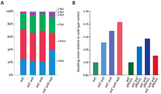One interesting feature of triple-origin cells is the increase in cells with no foci, while both oriC+ oriX+ and oriC+ oriZ+ cells show a decrease in comparison to wild-type cells. One explanation for this effect might be a limitation of initiation of DNA replication in triple-origin cells. It was reported before that multiple chromosomal locations, including the datA locus, bind the DnaA initiator protein with high affinity [33]. Upon initiation of chromosome replication, the duplication of these regions will act as a sink for DnaA, thereby reducing the concentration of free DnaA protein in the cell [34], which limits initiation of replication [35,36].