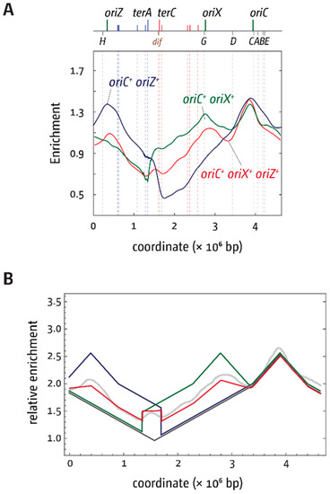 In contrast, integration of oriX into pheA was unproblematic, and replication profiles, as well as fluorescence microscopy analysis, confirmed that, in oriC+ oriX+ cells, both origins are active and fire with similar frequencies (Figure 3; Figure S2), as observed for oriC+ oriZ+ cells [18,19] (Figure 3).