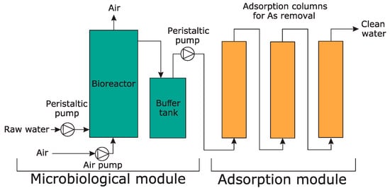 The pilot-scale installation used for remediation of arsenic contaminated water. The image is a schematic representation of the pilot-scale installation developed as part of this work. Both the microbiological and adsorption modules are shown.