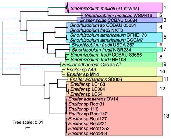 Phylogenetic analyses were performed to identify the relationships between Ensifer sp. M14 and previously sequenced Sinorhizobium/Ensifer strains. Forty-five Sinorhizobium/Ensifer genomes were downloaded from the NCBI database (see Materials and Methods for criteria for strain inclusion), and a maximum likelihood phylogeny of these strains plus Ensifer sp. M14 was built based on 1652 core genes (Figure 2).